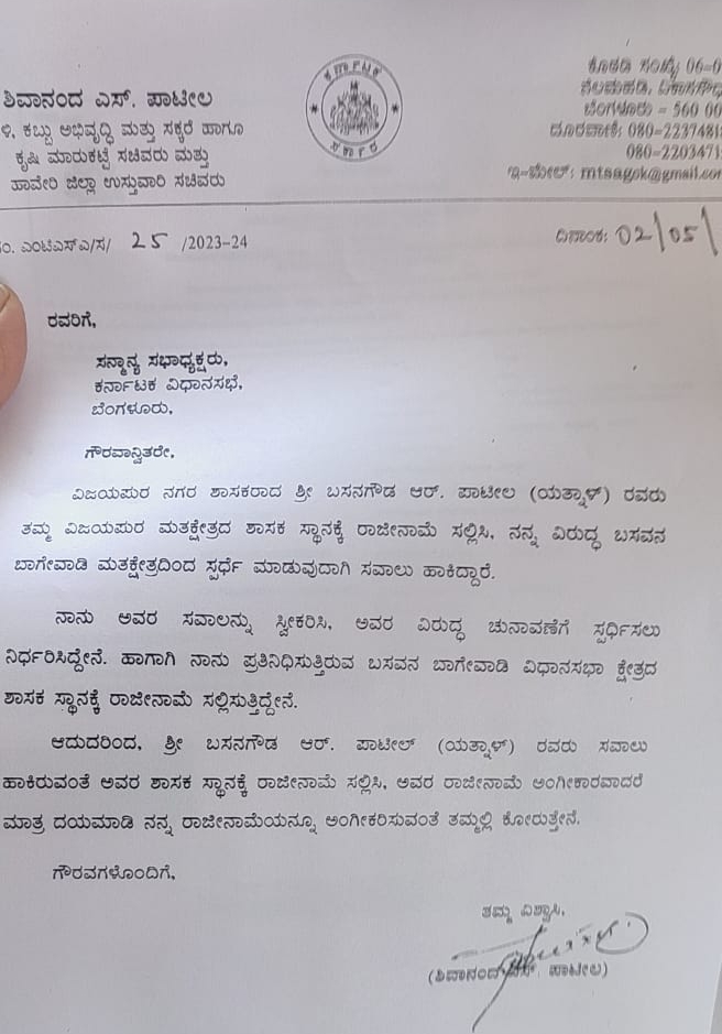 ರಾಜೀನಾಮೆ ಪತ್ರದಲ್ಲೇನಿದೆ: ”ವಿಜಯಪುರ ನಗರ ಶಾಸಕರಾದ ಬಸನಗೌಡ ಆರ್. ಪಾಟೀಲ್ (ಯತ್ನಾಳ್) ರವರು ತಮ್ಮ ವಿಜಯಪುರ ಮತ ಕ್ಷೇತ್ರದ ಶಾಸಕ ಸ್ಥಾನಕ್ಕೆ ರಾಜೀನಾಮೆ ಸಲ್ಲಿಸಿ, ನನ್ನ ವಿರುದ್ಧ ಬಸವನ ಬಾಗೇವಾಡಿ ಮತಕ್ಷೇತ್ರದಿಂದ ಸ್ಪರ್ಧೆ ಮಾಡುವುದಾಗಿ ಸವಾಲು ಹಾಕಿದ್ದಾರೆ. ನಾನು ಅವರ ಸವಾಲನ್ನು ಸ್ವೀಕರಿಸಿ, ಅವರ ವಿರುದ್ಧ ಚುನಾವಣೆಗೆ ಸ್ಪರ್ಧಿಸಲು ನಿರ್ಧರಿಸಿದ್ದೇನೆ. ಹಾಗಾಗಿ, ನಾನು ಪ್ರತಿನಿಧಿಸುತ್ತಿರುವ ಬಸವನ ಬಾಗೇವಾಡಿ ವಿಧಾನಸಭಾ ಕ್ಷೇತ್ರದ ಶಾಸಕ ಸ್ಥಾನಕ್ಕೆ ರಾಜೀನಾಮೆ ಸಲ್ಲಿಸುತ್ತಿದ್ದೇನೆ. ಆದುದರಿಂದ, ಬಸನಗೌಡ ಆರ್. ಪಾಟೀಲ್ (ಯತ್ನಾಳ್) ರವರು ಸವಾಲು ಹಾಕಿರುವಂತೆ ಅವರ ಶಾಸಕ ಸ್ಥಾನಕ್ಕೆ ರಾಜೀನಾಮೆ ಸಲ್ಲಿಸಬೇಕು. ಅವರ ರಾಜೀನಾಮೆ ಅಂಗೀಕಾರವಾದರೆ ಮಾತ್ರ, ದಯಮಾಡಿ ನನ್ನ ರಾಜೀನಾಮೆಯನ್ನೂ ಅಂಗೀಕರಿಸುವಂತೆ ತಮ್ಮಲ್ಲಿ ಕೋರುತ್ತೇನೆ” ಎಂದು ಶಿವಾನಂದ ಪಾಟೀಲ್ ಸ್ಪೀಕರ್ ಅವರನ್ನು ಕೋರಿದ್ದಾರೆ.