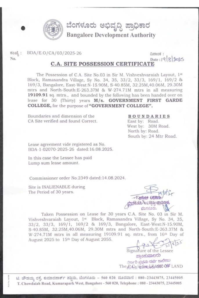 ಬಿಡಿಎ ಸರ್ಕಾರದ ಉದ್ದೇಶಕ್ಕಾಗಿ ಭೂಮಿಯನ್ನು 30 ವರ್ಷಗಳ ಅವಧಿಗೆ ಲೀಸ್ ನೀಡಿದ್ದು, ಶೈಕ್ಷಣಿಕ ಬಳಕೆಗೆ ಮೀಸಲಾಗಿರುವ ಈ ಭೂಮಿ ವಿದ್ಯಾರ್ಥಿಗಳಿಗೆ ಹೊಸ ಭವಿಷ್ಯ ಕಟ್ಟಲು ನೆರವಾಗಲಿದೆ.