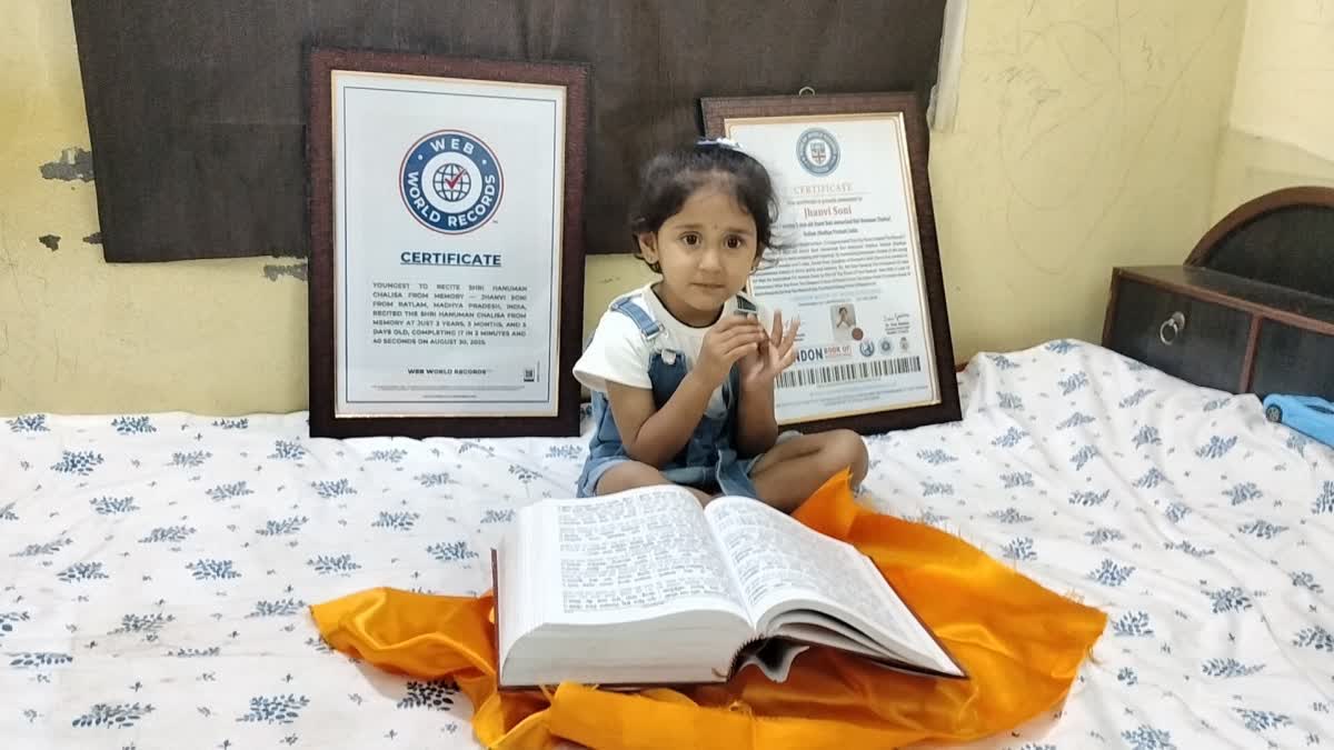 ರತ್ಲಂ (ಮಧ್ಯಪ್ರದೇಶ): ಮೂರು ವರ್ಷದ ಪುಟ್ಟ ಬಾಲಕಿ ಜಾನ್ವಿ ಸೋನಿ ಕೇವಲ 2 ನಿಮಿಷ 40 ಸೆಕೆಂಡುಗಳಲ್ಲಿ ಹನುಮಾನ್ ಚಾಲೀಸಾ ಪಠಿಸಿ ವಿಶ್ವದಾಖಲೆ ಬರೆದಿದ್ದಾಳೆ. ಈ ಸಾಧನೆಯು ಲಂಡನ್ ಬುಕ್ ಆಫ್ ವರ್ಲ್ಡ್ ರೆಕಾರ್ಡ್ಸ್ ಮತ್ತು ವೆಬ್ ವರ್ಲ್ಡ್ ರೆಕಾರ್ಡ್ಸ್ಗಳಲ್ಲಿ ನೊಂದಾಯಿತವಾಗಿದೆ.