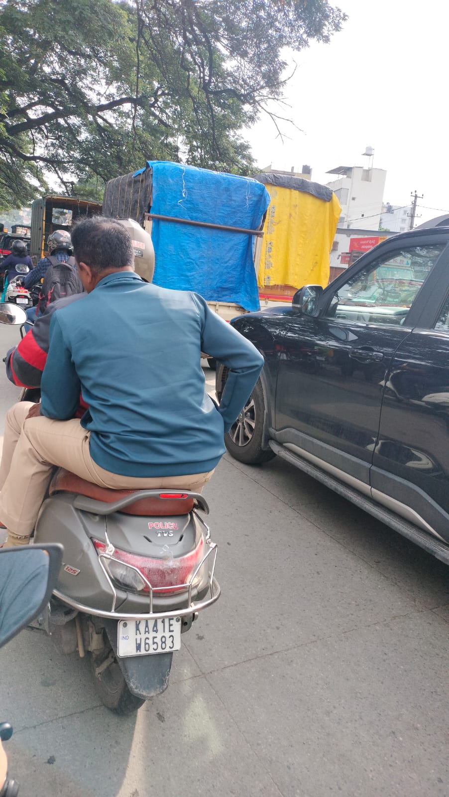 ಸಾಮಾನ್ಯ ಜನರು ಕಾನೂನು ಉಲ್ಲಂಘಿಸಿದಾಗ ತಮ್ಮ ತಪ್ಪಿಗೆ ದಂಡ ವಿಧಿಸಲಾಗುತ್ತದೆ. ಆದರೆ, ಇಂತಹ ಸಲುವಾಗಿ ಕೆಲಸ ಮಾಡಬೇಕಾದ ಪೊಲೀಸ್ ಸಿಬ್ಬಂದಿ ಸ್ವತಃ ನಿಯಮ ಉಲ್ಲಂಘಿಸುತ್ತಿರುವುದು ಸಾರ್ವಜನಿಕರಲ್ಲಿ ಆಕ್ರೋಶ ಸೃಷ್ಟಿಸಿದೆ. ಘಟನೆ ದಾಖಲಿಸಿರುವ ಫೋಟೋದಲ್ಲಿ ವಾಹನದ ಸಂಖ್ಯೆ KA 41E W 6583 ಸ್ಪಷ್ಟವಾಗಿ ಕಾಣುತ್ತಿದೆ.