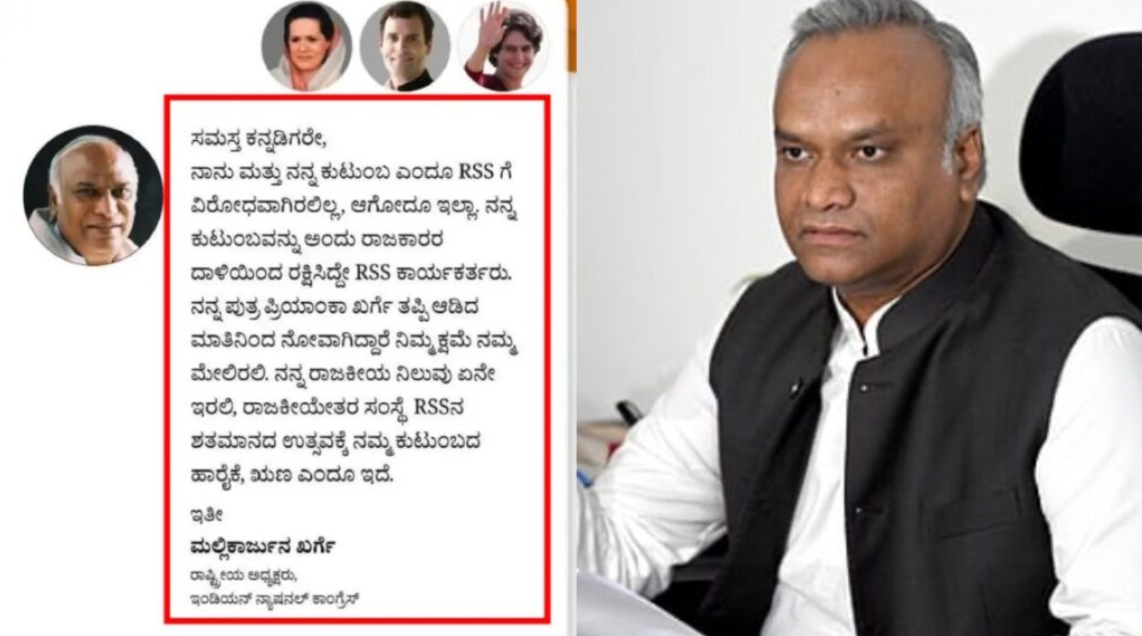 ಬೆಂಗಳೂರು: ರಾಜ್ಯದಲ್ಲಿ ಆರ್ಆರ್ಎಸ್ಎಸ್ ಚಟುವಟಿಕೆಗಳ ಮೇಲೆ ನಿರ್ಬಂಧ ಹೇರುವ ಕುರಿತು ಸಿಎಂ ಸಿದ್ದರಾಮಯ್ಯ ಅವರಿಗೆ ಪತ್ರ ಬರೆಯಲು ಕೇಸರಿ ಕಲಿಗಳ ಕೆಂಗಣ್ಣಿಗೆ ಗುರಿಯಾಗಿರುವ ಸಚಿವ ಪ್ರಿಯಾಂಕ್ ಖರ್ಗೆ ಭಾರೀ ಟೀಕೆ ಮತ್ತು ಬೆದರಿಕೆಗಳನ್ನು ಎದುರಿಸಿದ್ದಾರೆ. ಈ ನಡುವೆ, ಅವರ ತಂದೆ ಮತ್ತು ಐಸಿಸಿ ಅಧ್ಯಕ್ಷ ಮಲ್ಲಿಕಾರ್ಜುನ ಖರ್ಗೆ ಅವರ ಹೆಸರಿನಲ್ಲಿ ಸೃಷ್ಟಿಸಲ್ಪಟ್ಟ ನಕಲಿ ಪೋಸ್ಟ್ ಸಾಮಾಜಿಕ ಜಾಲತಾಣಗಳಲ್ಲಿ ವೈರಲ್ ಆಗಿದೆ.