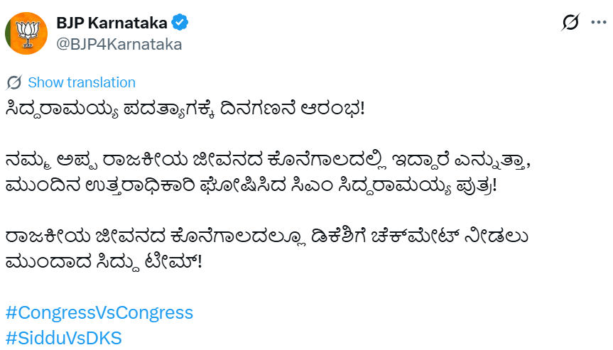 ಇದಕ್ಕೆ ಪ್ರತಿಯಾಗಿ ಬಿಜೆಪಿ ಟ್ವಿಟ್ಟರ್ (ಎಕ್ಸ್) ನಲ್ಲಿ ಕಟು ಟೀಕೆ ಮಾಡಿದ್ದು, “ಸಿದ್ದರಾಮಯ್ಯ ಪದತ್ಯಾಗಕ್ಕೆ ದಿನಗಣನೆ ಆರಂಭವಾಗಿದೆ. ನಮ್ಮ ಅಪ್ಪ ರಾಜಕೀಯ ಜೀವನದ ಕೊನೆಗಾಲದಲ್ಲಿದ್ದಾರೆ ಎಂದು ಹೇಳಿ, ಮುಂದಿನ ನಾಯಕನ ಸೂಚನೆ ನೀಡಿದ ಯತೀಂದ್ರ – ಡಿಕೆಶಿಗೆ ಚೆಕ್ಮೇಟ್ ನೀಡಲು ಸಿದ್ದು ಟೀಮ್ ಸಜ್ಜಾಗಿದೆ” ಎಂದು ಟ್ವೀಟ್ನಲ್ಲಿ ವ್ಯಂಗ್ಯವಾಡಿದೆ.