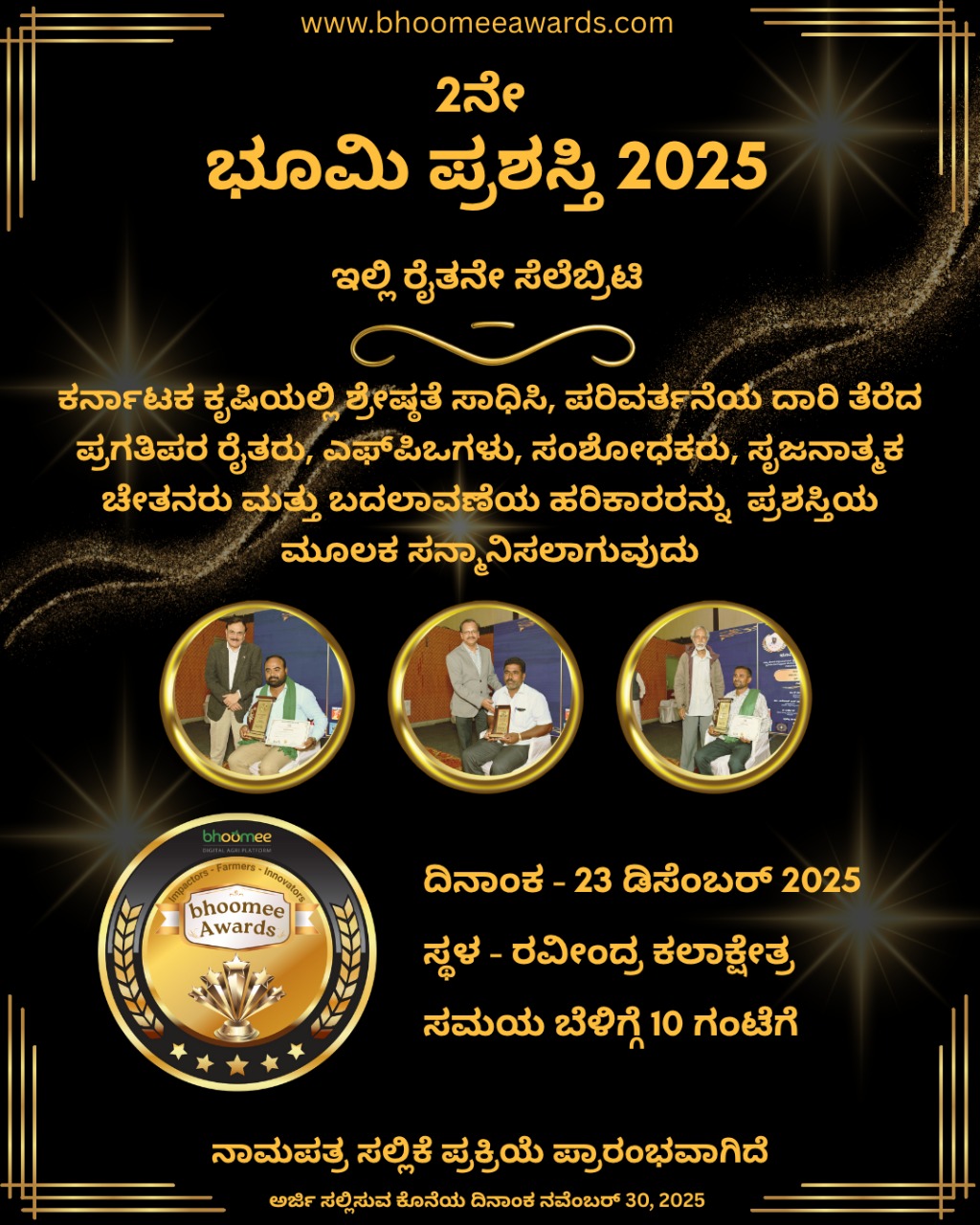 ಕಾರ್ಯಕ್ರಮದಲ್ಲಿ ಸಾಂಸ್ಕೃತಿಕ ಕಾರ್ಯಕ್ರಮಗಳು ಮತ್ತು ಕೃಷಿ ಕುರಿತ ಉಪನ್ಯಾಸಗಳೂ ನಡೆಯಲಿದ್ದು, ಅನೇಕ ಗಣ್ಯರು ಪಾಲ್ಗೊಳ್ಳಲಿದ್ದಾರೆ. ಅರ್ಜಿ ಸಲ್ಲಿಸಲು ರೈತರು www.bhoomeeawards.com ವೆಬ್ಸೈಟ್ಗೆ ಭೇಟಿ ನೀಡಬಹುದು ಅಥವಾ 7483074266 ಸಂಖ್ಯೆಗೆ ಸಂಪರ್ಕಿಸಬಹುದು.