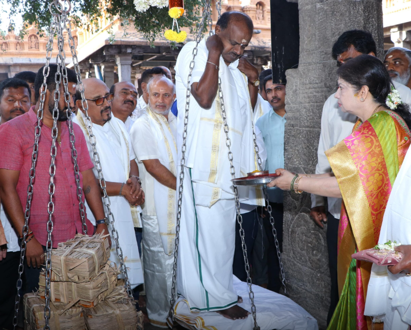 ನಂಜನಗೂಡು: ದಕ್ಷಿಣಕಾಶಿ ಎಂದೇ ಖ್ಯಾತಿಯಾದ ನಂಜನಗೂಡಿನ ಶ್ರೀಕಂಠೇಶ್ವರ ಸ್ವಾಮಿಗೆ ಕೇಂದ್ರ ಸಚಿವ ಹೆಚ್.ಡಿ. ಕುಮಾರಸ್ವಾಮಿ ಅವರು ಶುಕ್ರವಾರ ಭೇಟಿ ನೀಡಿ ವಿಶೇಷ ಪೂಜೆ ಸಲ್ಲಿಸಿದರು. ಪತ್ನಿ ಅನಿತಾ ಕುಮಾರಸ್ವಾಮಿ ಅವರ ಜೊತೆ ಬಂದಿದ್ದ ಅವರು ಬೆಲ್ಲದ ತುಲಾಭಾರ ಮಾಡಿಸಿಕೊಂಡು ಹಿಂದಿನ ಹರಕೆಯನ್ನು ತೀರಿಸಿದರು.