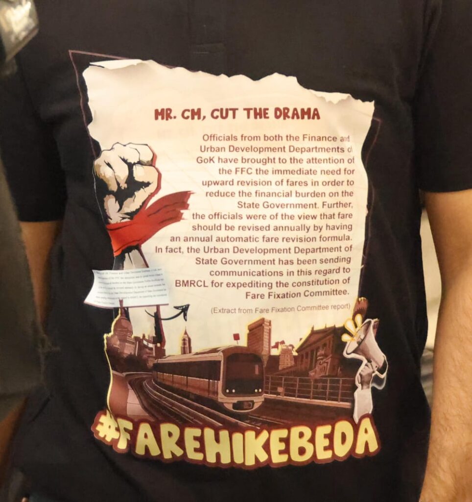 ಮೆಟ್ರೋ ದರ ಏರಿಕೆಯನ್ನು ತಾವು ಕೋರಿಲ್ಲ ಎಂದು ಕಾಂಗ್ರೆಸ್ ಸರ್ಕಾರ ಹೇಳುತ್ತಿರುವ ಬೆನ್ನಲ್ಲೇ, ದರ ನಿಗದಿ ಸಮಿತಿ (FFC) ವರದಿಯ ಆಯ್ದ ಭಾಗವನ್ನು ತಮ್ಮ ಟೀ-ಶರ್ಟ್ ಮೇಲೆ ಮುದ್ರಿಸಿ ಸರ್ಕಾರದ ಅಧಿಕಾರಿಗಳೇ ದರ ಏರಿಕೆಗೆ ಒತ್ತಾಯಿಸಿದ್ದರು ಎಂಬುದನ್ನು ಸೂರ್ಯ ಬಹಿರಂಗಪಡಿಸಿದರು.