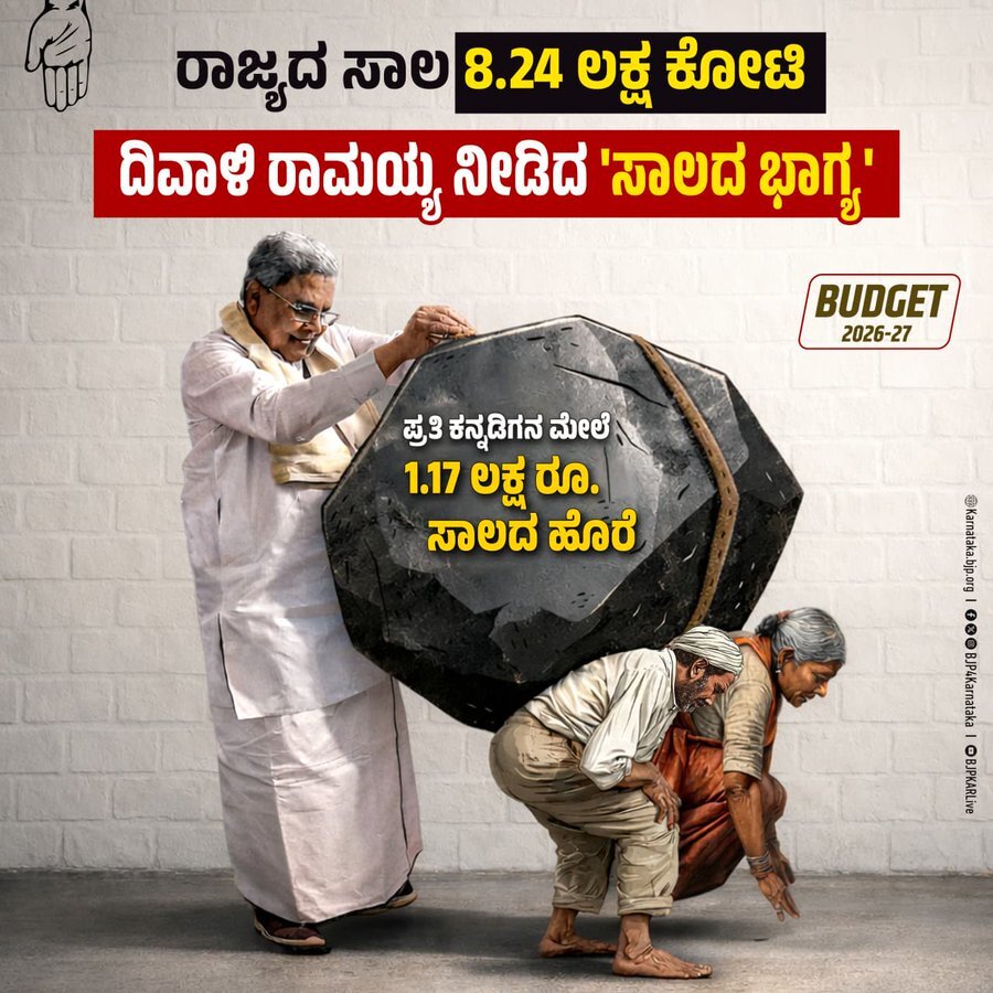 ರಾಜ್ಯದ ಒಟ್ಟು ಸಾಲ 8.24 ಲಕ್ಷ ಕೋಟಿ ರೂ. ಮೀರಿದ್ದು, ಪ್ರತಿ ಕನ್ನಡಿಗನ ಮೇಲೆ ಸರಾಸರಿ 1.17 ಲಕ್ಷ ರೂ. ಸಾಲದ ಹೊರೆ ಬಂದಿದೆ. “ಸಾಲ ಮಾಡುವುದರಲ್ಲಿ ನಂಬರ್ 1, ಅಭಿವೃದ್ಧಿ ಮಾತ್ರ ಶೂನ್ಯ” ಎಂಬುದೇ ಕಾಂಗ್ರೆಸ್ ಸರ್ಕಾರದ ಸಾಧನೆ ಎಂದು ಬಿಜೆಪಿ ವಾಗ್ದಾಳಿ ನಡೆಸಿದೆ.