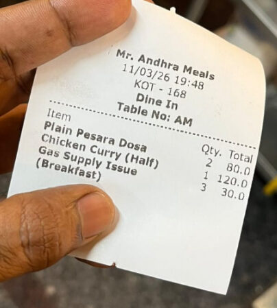 ನಗರದ ಪಿಜಿಯಲ್ಲಿ ಬೆಳಗಿನ ತಿಂಡಿ ಸಿಗದ ಕಾರಣ ಗ್ರಾಹಕರೊಬ್ಬರು Mr. Andhra Meals ಹೋಟೆಲ್ಗೆ ತೆರಳಿ ಬ್ರೇಕ್ಫಾಸ್ಟ್ ಮಾಡಿಕೊಂಡಿದ್ದಾರೆ. ಆದರೆ ಬಿಲ್ ಪರಿಶೀಲಿಸಿದಾಗ ಅದರಲ್ಲಿ Gas Supply Charge ಎಂಬ ಹೆಸರಿನಲ್ಲಿ ಹೆಚ್ಚುವರಿ ಮೊತ್ತ ಸೇರಿಸಿದ್ದನ್ನು ಕಂಡು ಅವರು ಅಚ್ಚರಿಗೊಂಡಿದ್ದಾರೆ.