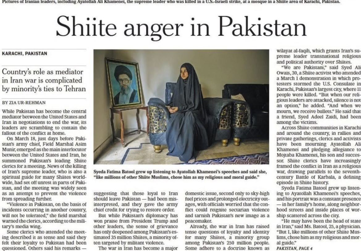 ಜಿಯಾ ಉರ್ ರೆಹಮಾನ್ ಬರೆದಿದ್ದ ಈ ವರದಿ, ಪಶ್ಚಿಮ ಏಷ್ಯಾದ ಉದ್ವಿಗ್ನ ಪರಿಸ್ಥಿತಿ ಮತ್ತು ಅದರ ಪರಿಣಾಮವಾಗಿ ಪಾಕಿಸ್ತಾನದ ಶಿಯಾ ಸಮುದಾಯದಲ್ಲಿ ಉಂಟಾಗಿರುವ ಆಕ್ರೋಶವನ್ನು ವಿವರಿಸಿತ್ತು. ಸುಮಾರು 3.5 ಕೋಟಿ ಶಿಯಾ ಮುಸ್ಲಿಮರು ಸರ್ಕಾರದ ನೀತಿಗಳ ವಿರುದ್ಧ ಅಸಮಾಧಾನ ವ್ಯಕ್ತಪಡಿಸುತ್ತಿದ್ದಾರೆ ಎಂದು ವರದಿ ಹೇಳಿತ್ತು.