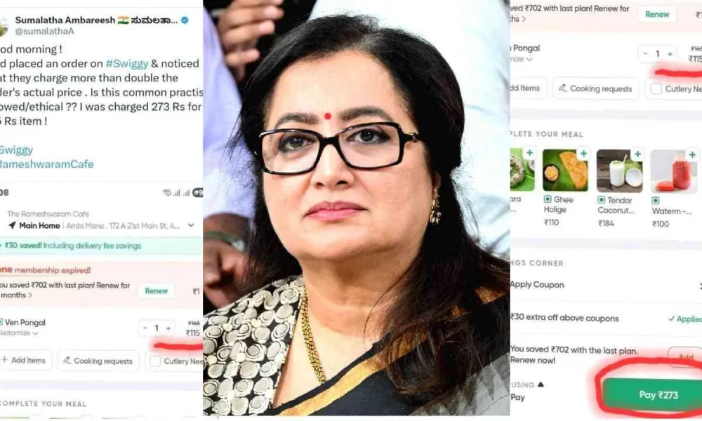 ಆನ್ಲೈನ್ ಫುಡ್ ಡೆಲಿವರಿ ಸೇವೆಗಳಲ್ಲಿನ ಹೆಚ್ಚುವರಿ ಶುಲ್ಕಗಳ ಬಗ್ಗೆ ಗ್ರಾಹಕರ ಅಸಮಾಧಾನ ಹೆಚ್ಚುತ್ತಿರುವ ನಡುವೆಯೇ, ಇದೀಗ ಮಾಜಿ ಸಂಸದೆ Sumalatha Ambareesh ಅವರು Swiggy ವಿರುದ್ಧ ಅಸಮಾಧಾನ ವ್ಯಕ್ತಪಡಿಸಿದ್ದಾರೆ. ತಾವು ಆರ್ಡರ್ ಮಾಡಿದ ಪೊಂಗಲ್ ದರಕ್ಕಿಂತ...